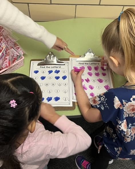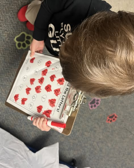 PreK students find letters on a hallway scavenger hunt! They love helping each other with hidden letters!