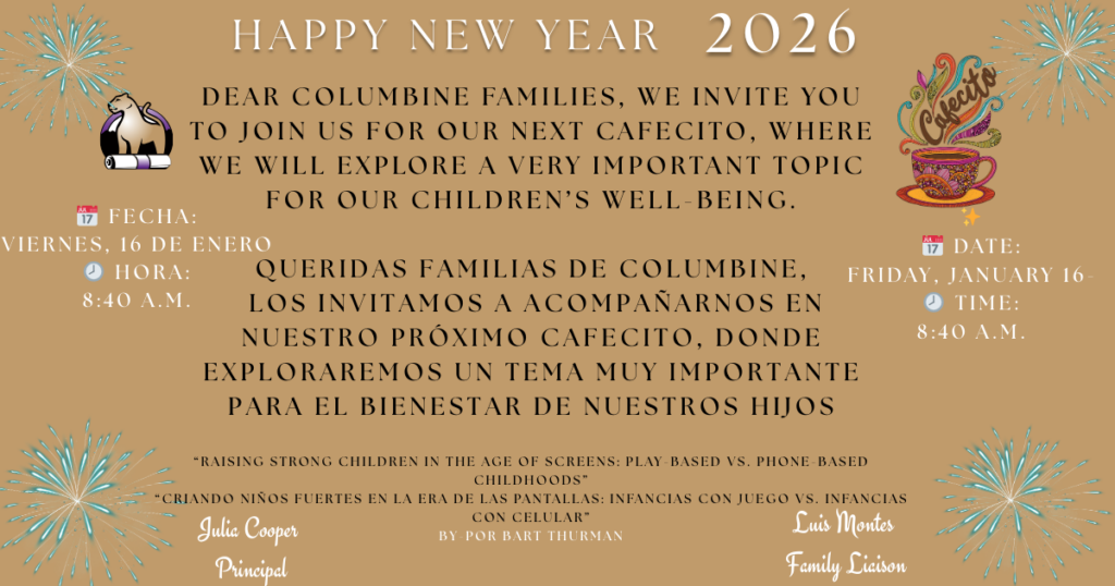 December was a wonderful month at Columbine! Students impressed us with their focus and effort during iReady mid-year benchmark testing, and we are already seeing strong growth across grade levels. Our Specials Showcase highlighted the creativity in art, music, and PE, and Cafecito brought families together in meaningful conversation. A huge highlight was our Columbine Talent Show and Community Caroling events—thank you to everyone who joined us for these!